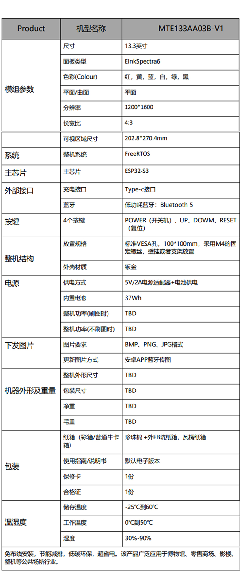 13.3寸電子紙墨水屏相框全彩低功耗1200*1600藍(lán)牙